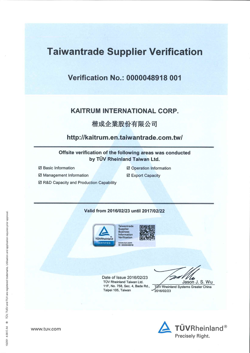 | Taiwan Trade Verification | ISO9001_2008證書 |
