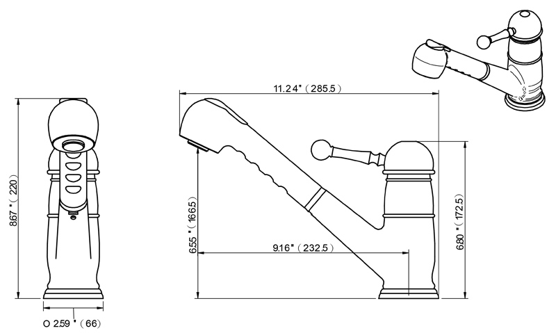 尺寸:(整體高度)220 mm /(噴嘴高度)166.5 mm /(噴嘴長度)232.5 mm