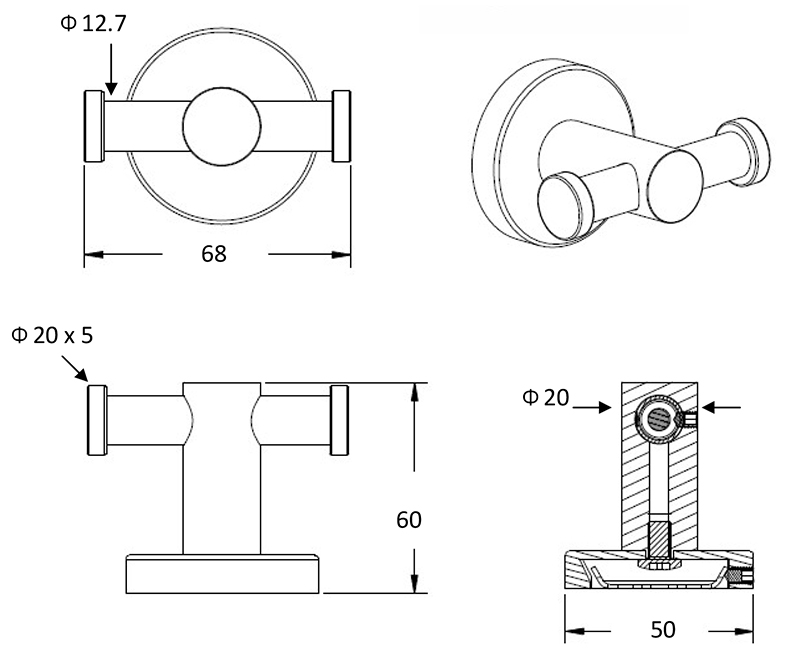 雙鈎 尺寸:長 x 寬 x 高 2.2" x 2.7" x 2" / 55 x 68 x 50 mm