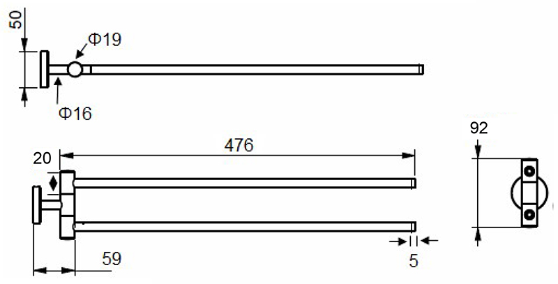 旋臂毛巾桿 尺寸:476 x 92 x 59 mm (tube Ø 12.7 mm) 材質:銅 表面處理:亮鉻 / 沙丁鎳