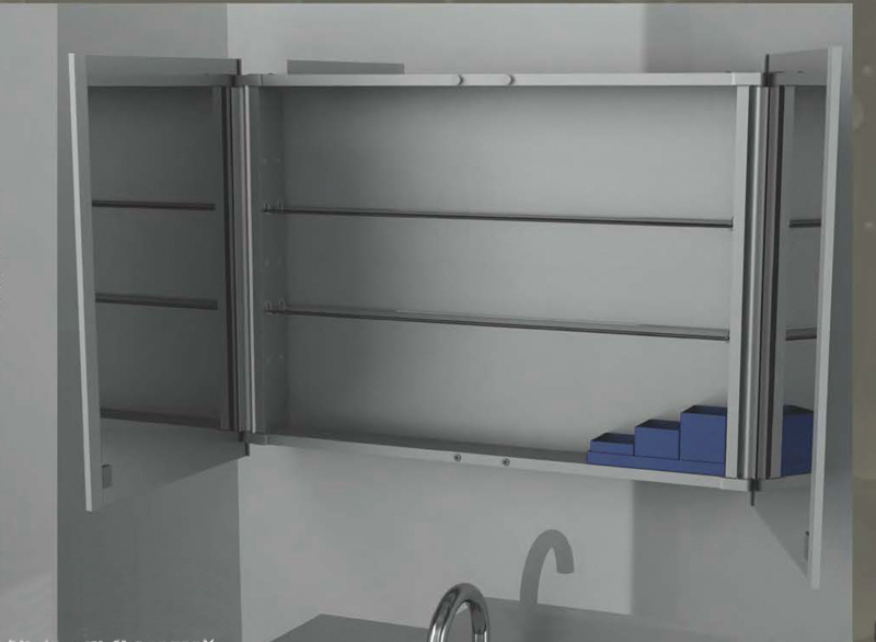 尺寸:長 x 寬 x 高 800 x 100 x 600 mm / 31.5" x 4" x 23.6" 顏色:陽極氧化鋁外殼 雙面鏡門(3 mm+3 mm) 2可調節擱板(鋼化玻璃厚度為4mm)
