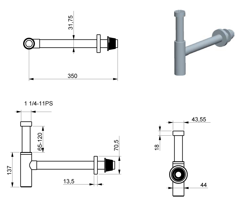 尺寸:Ø70 x 350 x 65 ~ 120 mm