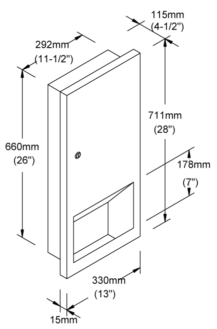 尺寸:寬 x 高 x 深 全部尺寸:13" x 28" x 4.5" / 330 mm x 711 mm x 115 mm 牆面尺寸:12" x 26.5" x 4.3" / 305 mm x 673 mm x 108mm 材質:不銹鋼 304 顏色:緞面