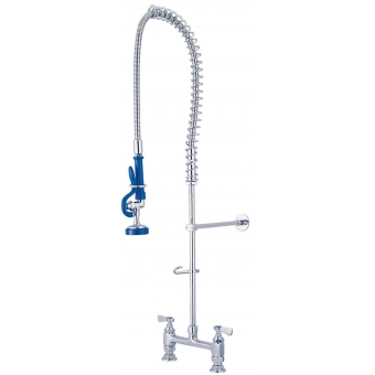 · 檯式重型混合水龍頭 · 間距為8” (203mm) · 噴閥流量1.6GPM(6.06LPM) · 44”(1118mm) 不銹鋼軟管附握桿 · 11”(280mm) 牆上托架 · 1/2” NPT 內螺紋進水口