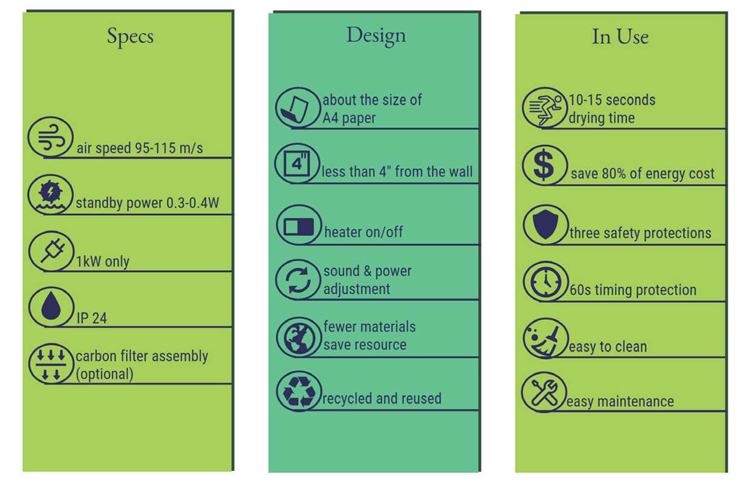 * Less power consumption: high-speed hand dryers dry the hands by blowing high- speed air, rather than the high-temperature air, which makes them consume less power than conventional ones.